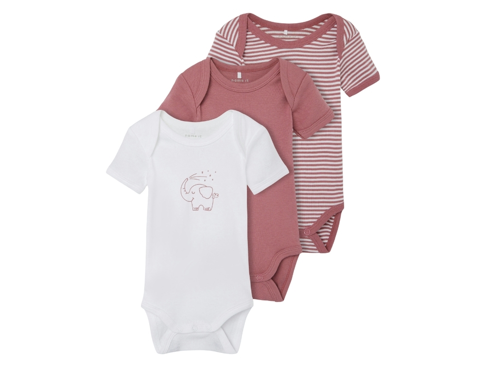 The pack includes 1 solid-colored bodysuit in mesa rose, 1 white bodysuit with elephant print, and 1 striped bodysuit.