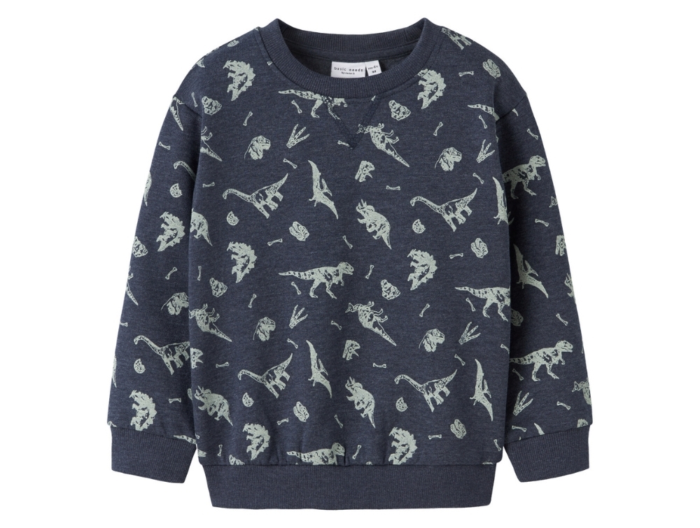 Sweatshirt in dark blue shade (navy blazer) from Name It MINI with fun all-over dinosaur print. The soft brushed inside makes it comfortable to wear and ideal for everyday play.