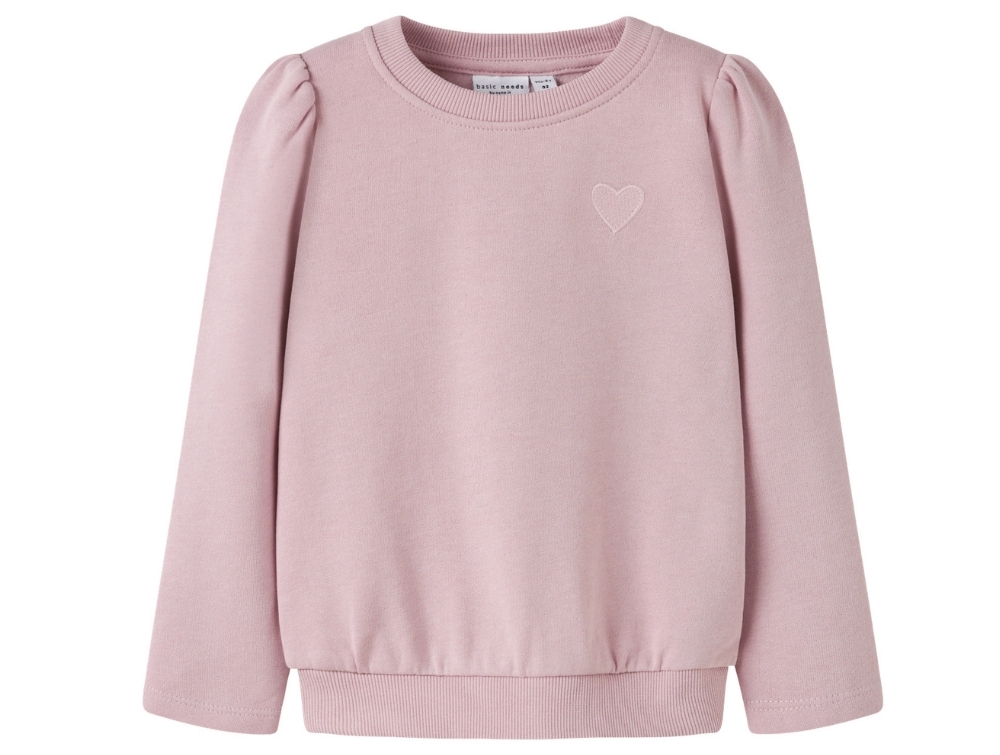 Sweatshirt in light pink shade (burnished lilac) from Name It MINI featuring a sweet embroidered heart on the chest. The soft brushed inside provides extra comfort for everyday wear.