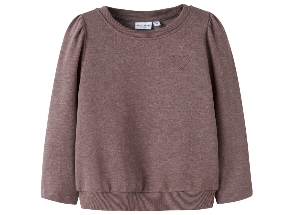 Sweatshirt in brown shade (peppercorn) from Name It MINI featuring an embroidered heart on the chest. Made from soft brushed sweat fabric for extra comfort, perfect for everyday wear.