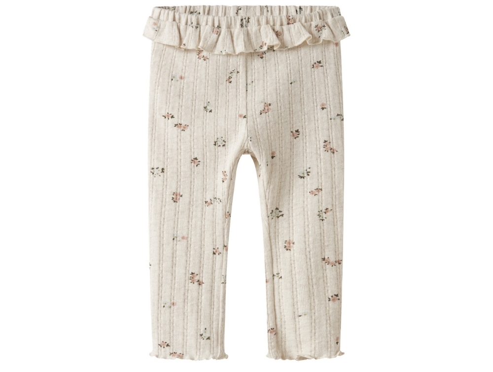 Leggings in an off-white shade from Name It featuring a delicate pointelle texture and small floral print. The rib-knit fabric offers a soft feel and gentle stretch, making them comfortable for little ones.
