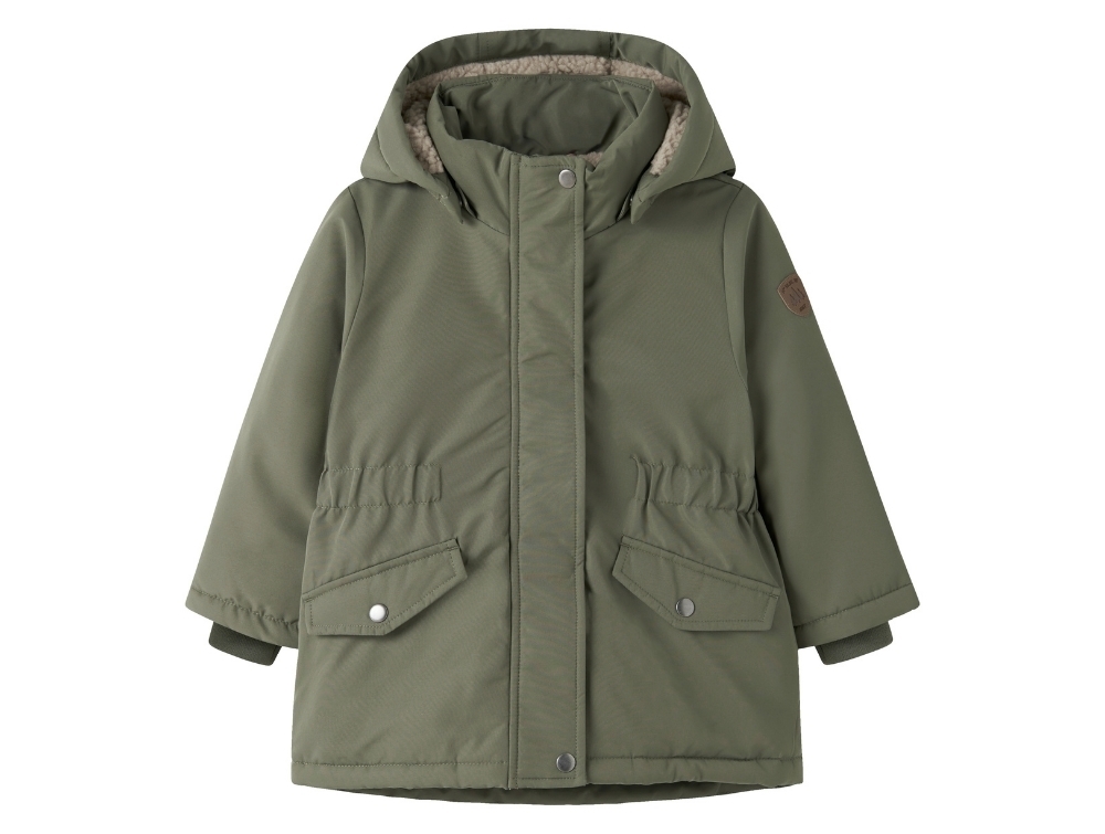 Muted green (dusty olive) winter parka jacket from Name It with teddy lining in the upper part and hood.