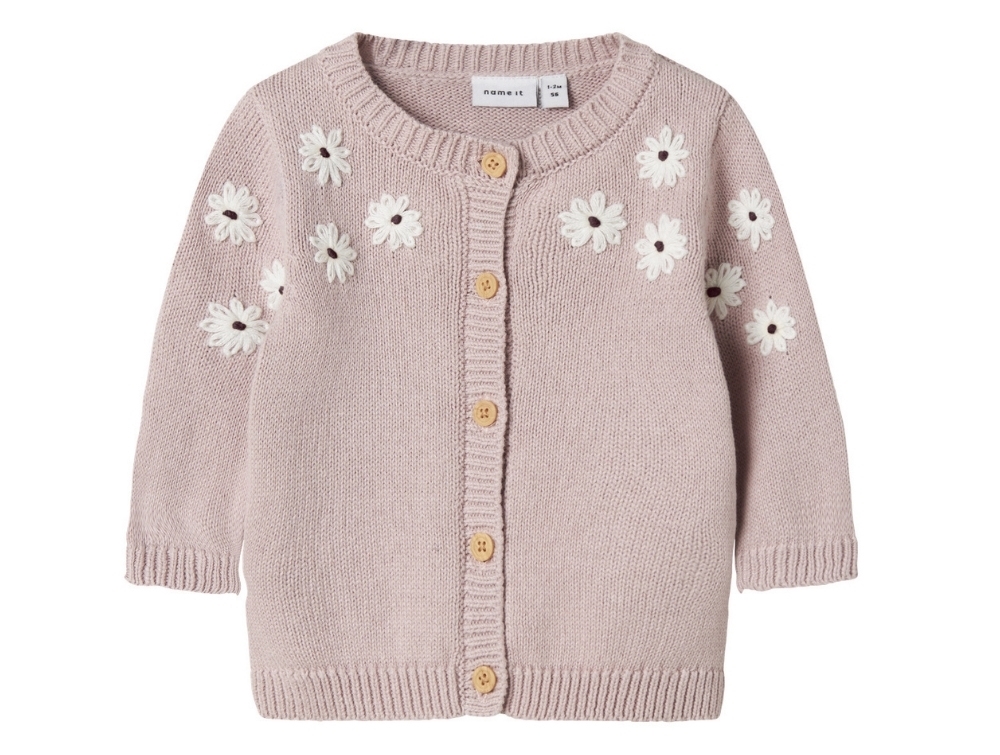 Cardigan in light pink shade from Name It with lovely floral embroidery on the front and shoulders. Made from 100% organic cotton with a soft, smooth surface that feels gentle on the skin.