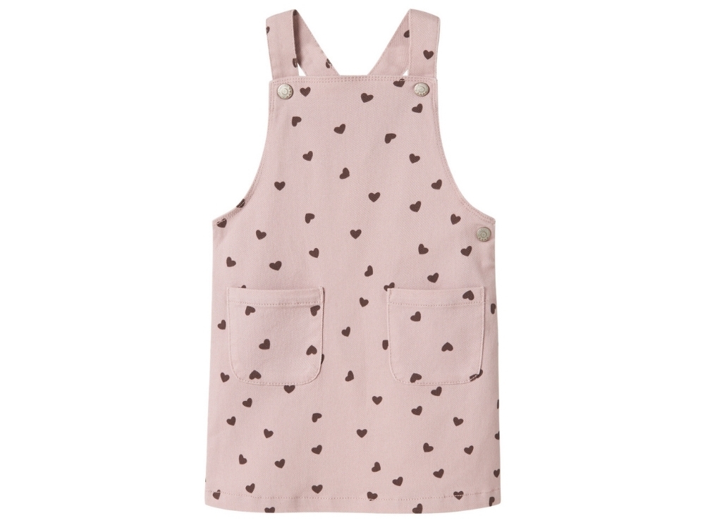 Pinafore dress in a soft pink shade (burnished lilac) from Name It with a cute all-over heart print. The dress features adjustable straps with press buttons and two front pockets for a practical and classic look.