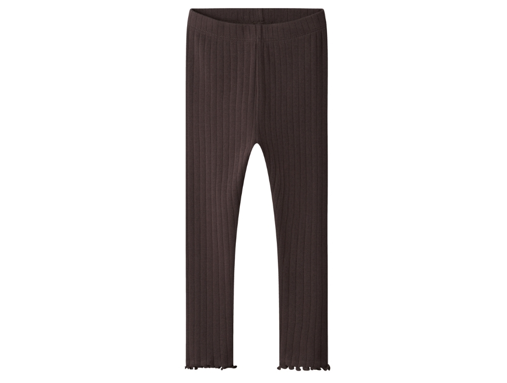 Leggings in dark brown shade (seal brown) from Name It with delicate wavy babylock hems at the bottom.