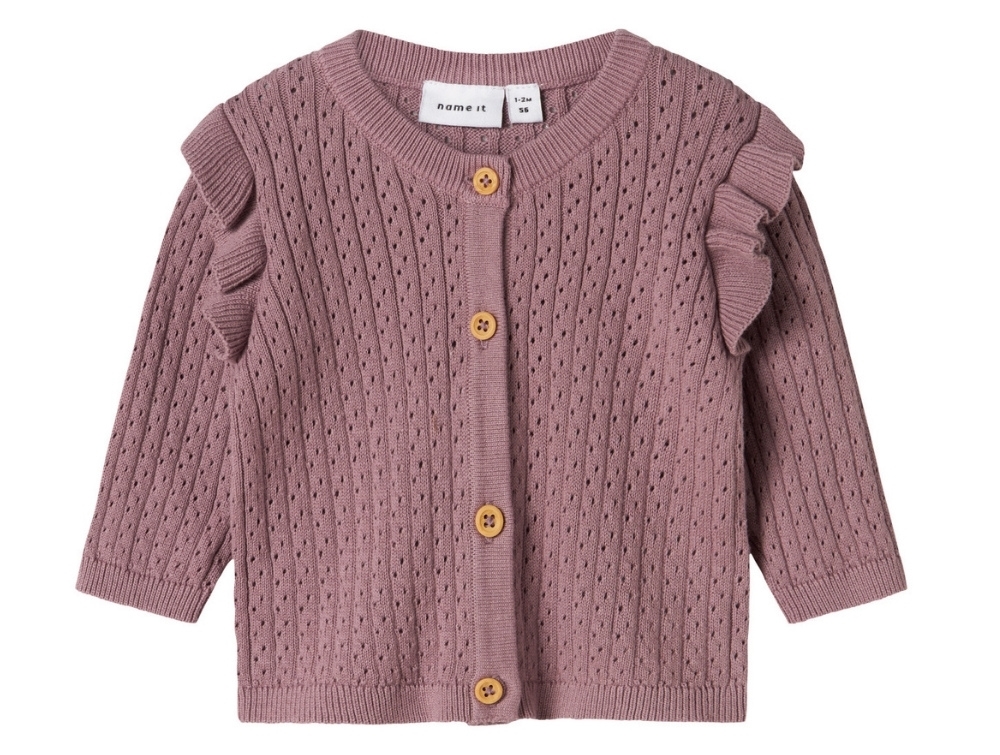 Cardigan in pink shade (toadstool) from Name It featuring delicate frill details on the shoulders.