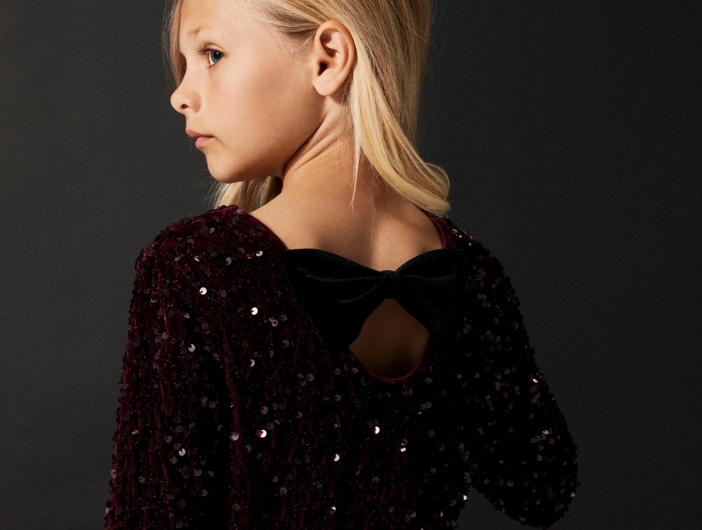 Burgundy dress from Name It featuring long sleeves and shimmering sequins for a festive and elegant look.