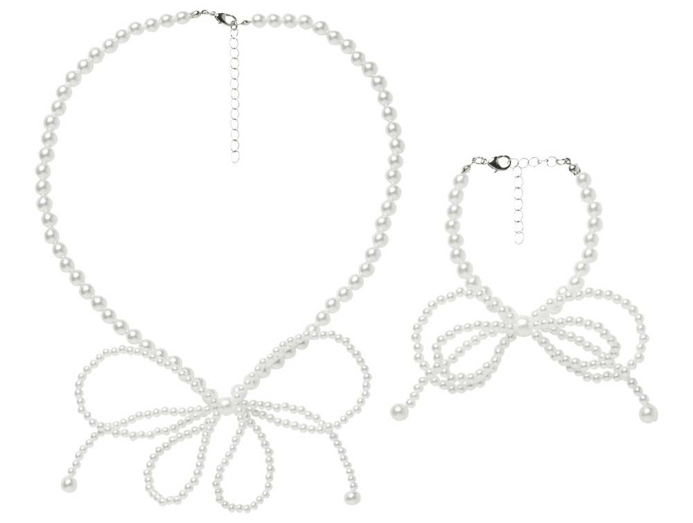 The set includes a necklace and bracelet decorated with pearls and a delicate bow shape at the front.