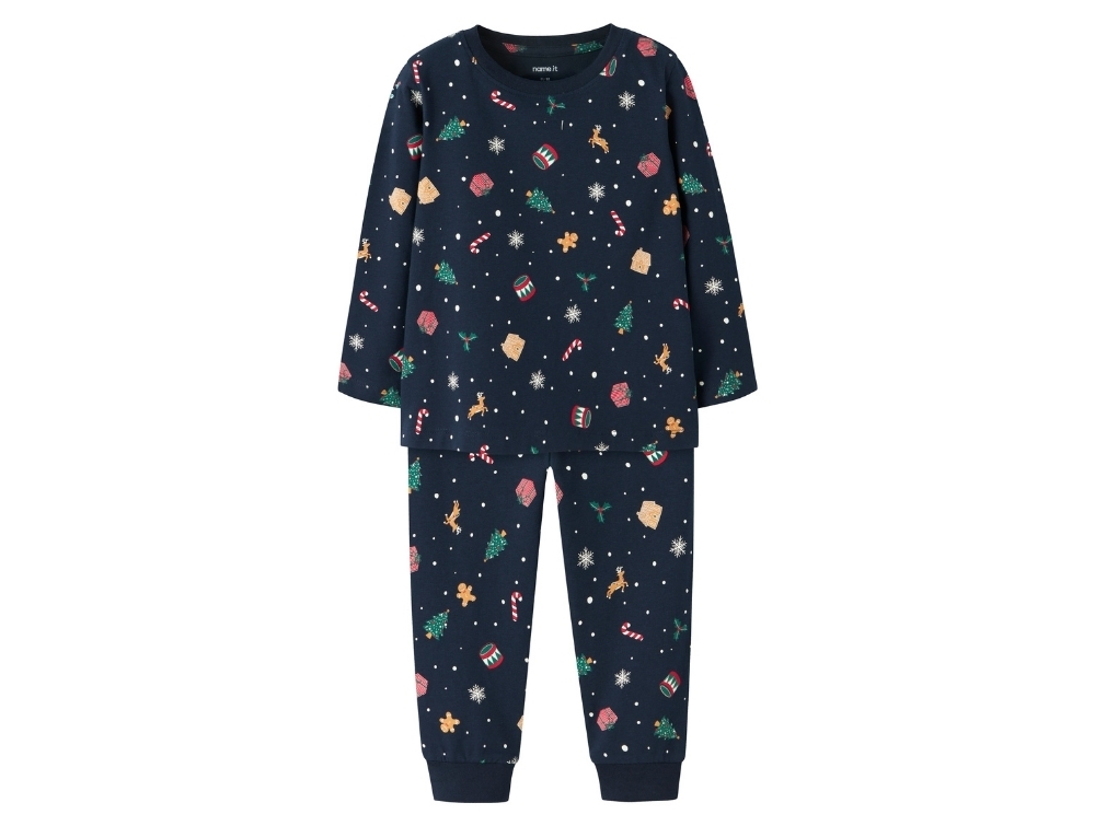 Pyjamas in dark blue shade (navy blazer) from Name It with all-over Christmas print featuring reindeers, drums, Christmas trees and gingerbread men.