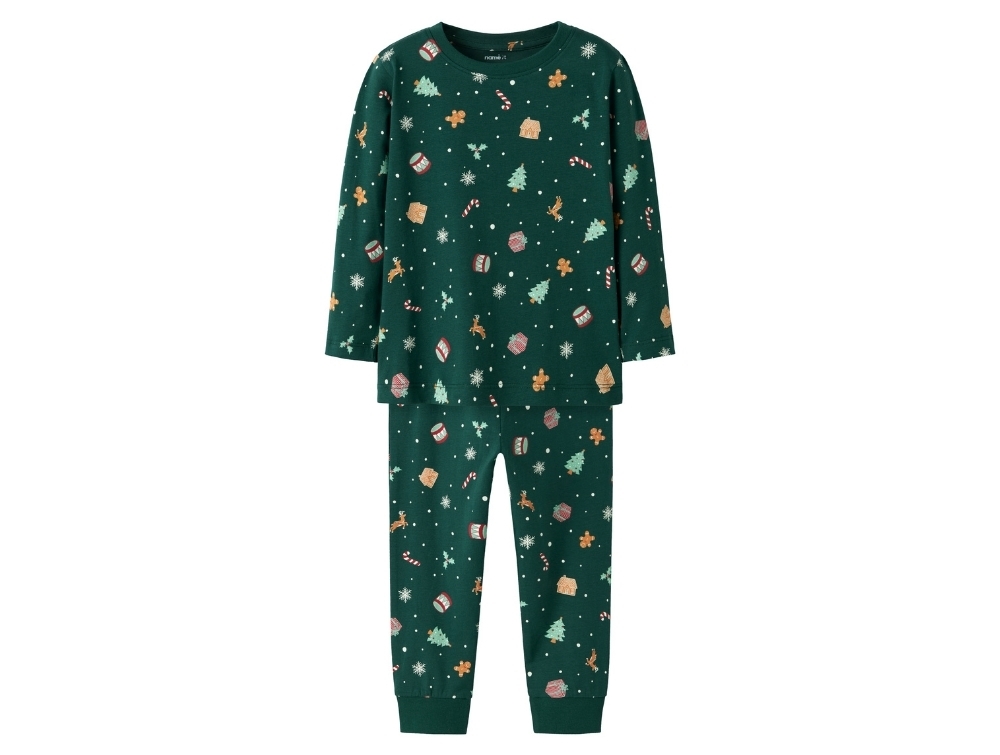 Pyjamas in green shade (botanical garden) from Name It with all-over Christmas print featuring reindeers, drums, Christmas trees and gingerbread men.