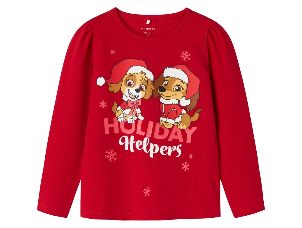Blouse in red shade (barbados cherry) from Name It with a festive Paw Patrol print on the front.