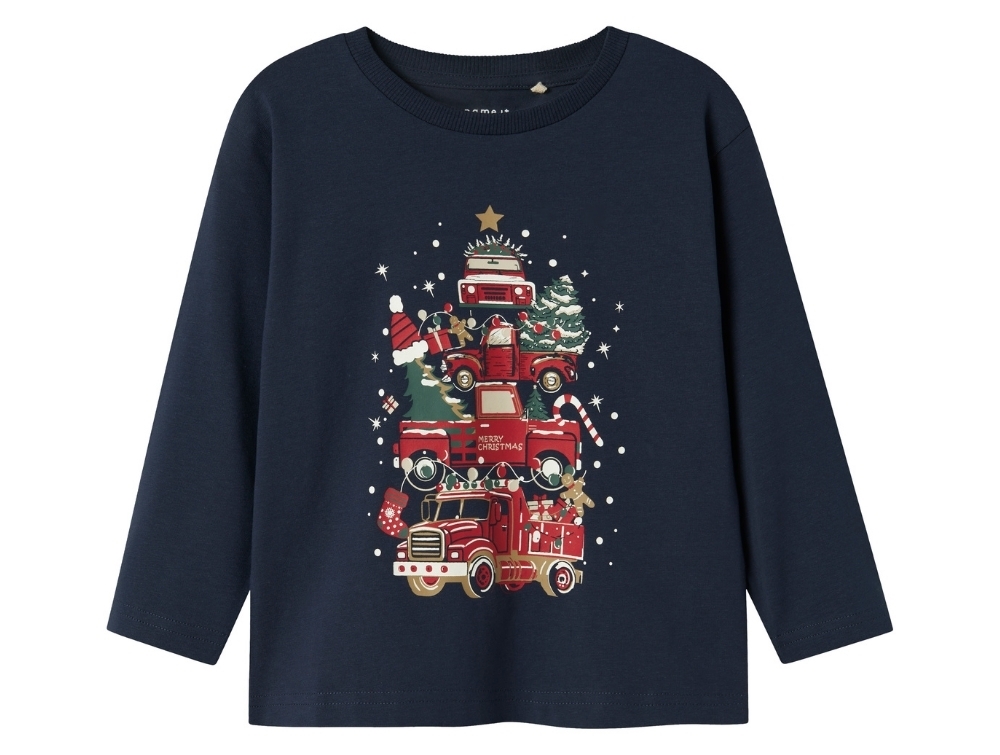 Blouse in dark blue shade (navy blazer) from Name It with a festive Christmas truck print featuring trees, gifts and stars. A playful and cheerful style for December.