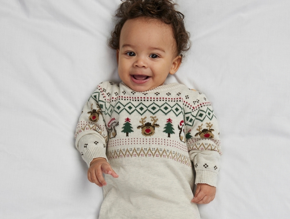 Knit jumpsuit in off-white shade (peyote melange) from Name It with Christmas pattern featuring reindeer, Christmas trees and Santa hats. A cozy and warm style for the holiday season.