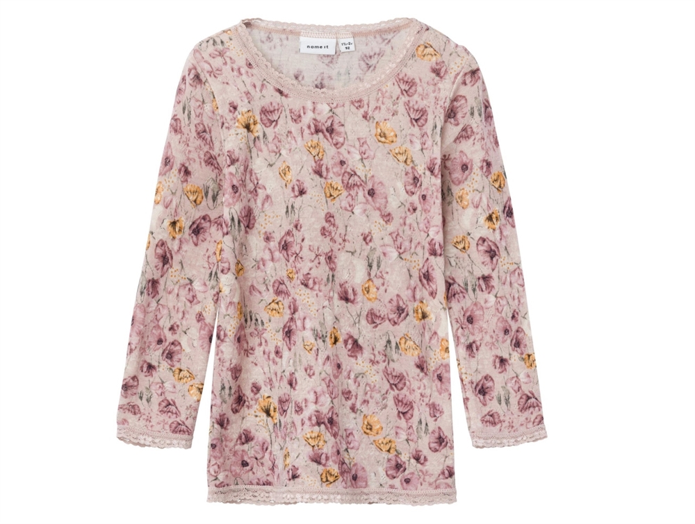 This beautiful top/blouse from Name It, in the color "sphinx" (pink), features a lovely flower print, perfect as an inner layer during the cold months.
