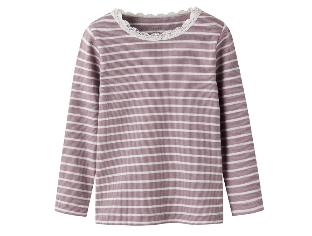 Dusty pink top (toadstool) from Name It MINI with stripes and delicate lace trim at the neckline. A soft ribbed blouse with a hint of glitter and a comfortable slim fit.