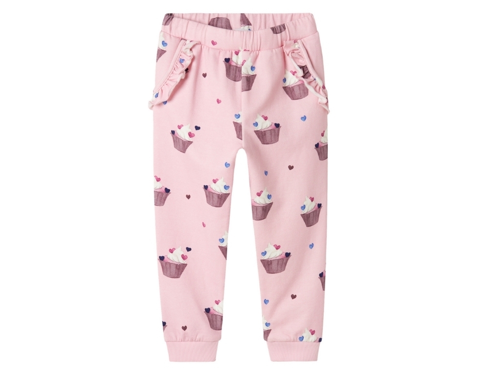 Pink trousers (sweet dreams) from Name It MINI featuring a cute cupcake print and frill details by the pockets. Soft and comfortable, perfect for everyday play.