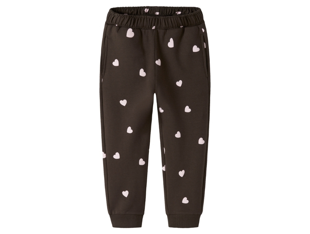 Dark brown trousers (delicioso) from Name It MINI featuring a sweet all-over heart print. A soft and cozy style with ribbed cuffs, perfect for everyday wear.