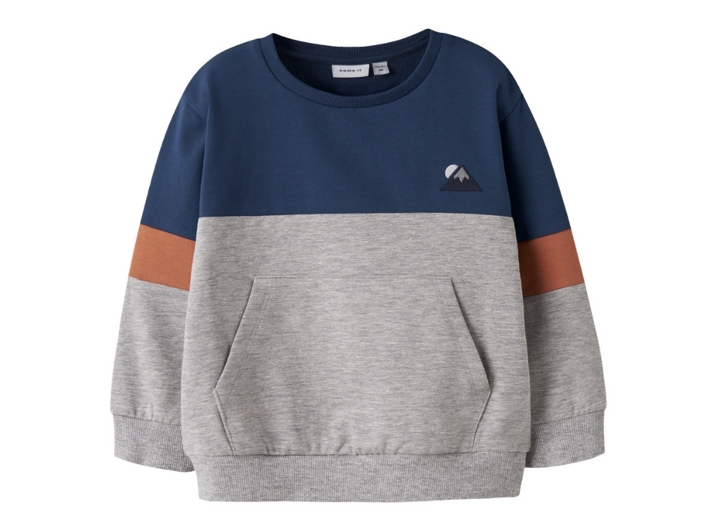 Blue sweatshirt (insignia blue) from Name It MINI featuring an embroidered mountain motif and color-block design. Made in soft brushed sweat fabric for everyday comfort and warmth.