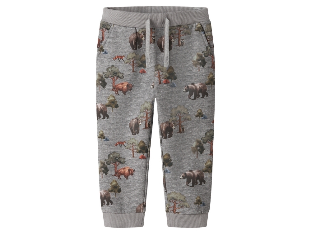Grey melange trousers from Name It MINI featuring a forest animal print with bears, foxes and trees. Soft brushed sweat fabric provides warmth and freedom to move – perfect for everyday wear.