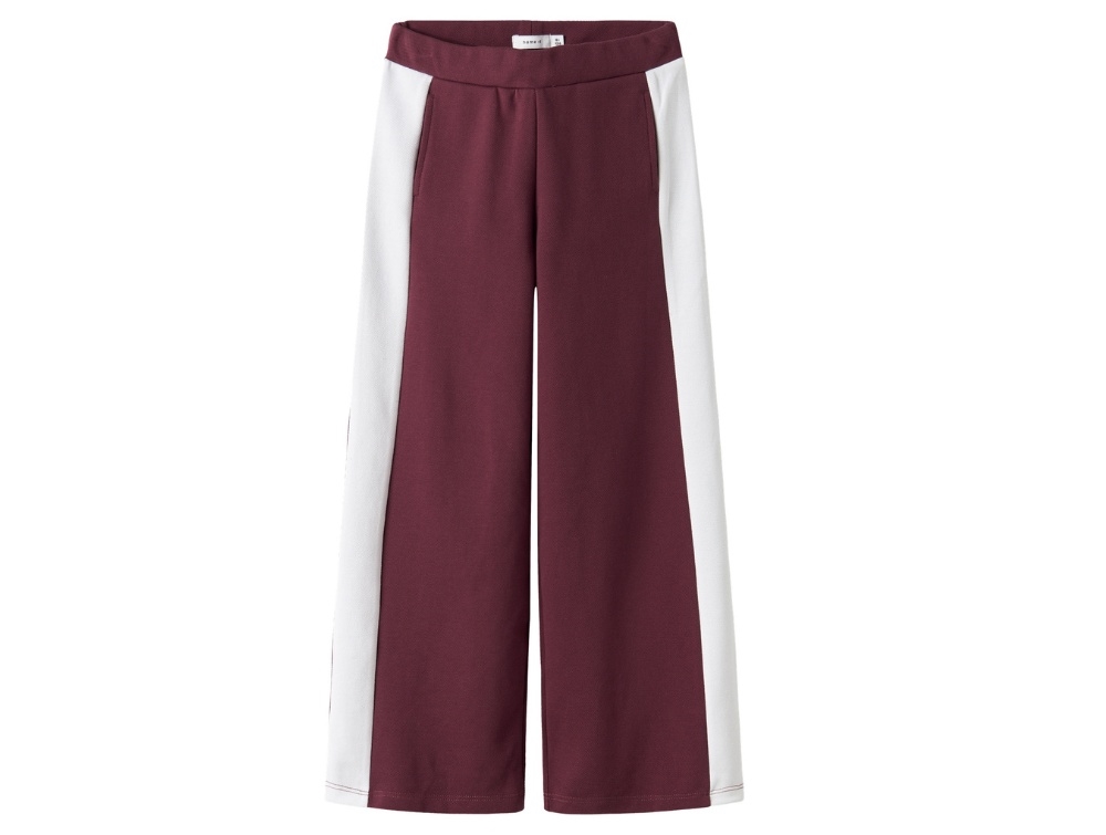 Trousers in a dark red shade from Name It. The style features wide legs, an elasticated waist and a contrast stripe along the side.
