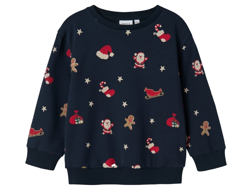 Sweatshirt in dark blue shade (navy blazer) from Name It with a festive all-over print featuring Santas, gingerbread men, stars and other Christmas motifs.