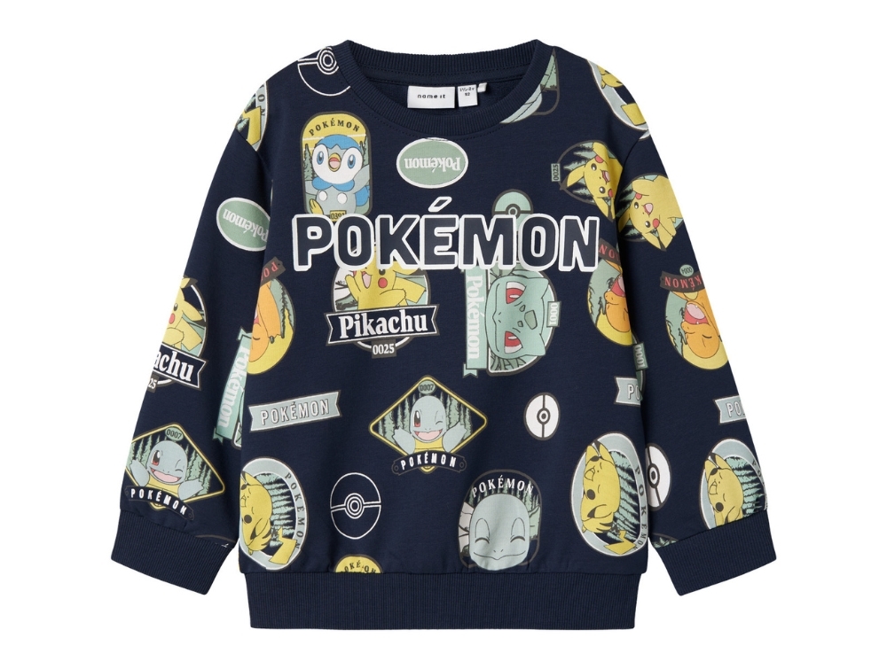 Sweatshirt in dark navy shade from Name It featuring colourful Pokémon prints all over. The design includes Pikachu, Squirtle and Bulbasaur in a fun and classic look that Pokémon fans will love.