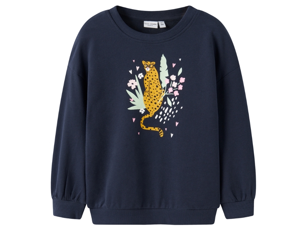Sweatshirt in dark navy shade from Name It featuring a colourful cheetah print surrounded by flowers and leaves. Made from soft 100% cotton for a comfortable feel against the skin, with a relaxed fit perfect for everyday wear.