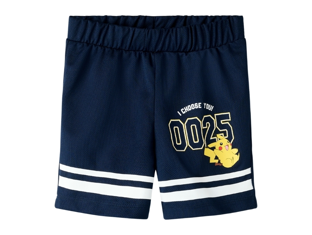 Shorts in a dark blue shade (Navy Blazer) from Name It featuring a Pokémon print with Pikachu on the leg.