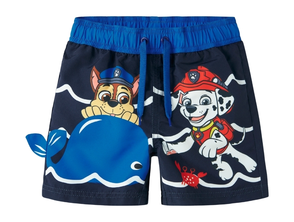 Swim shorts in a dark blue shade (Navy Blazer) from Name It featuring a large Paw Patrol print with the characters Chase and Marshall on the leg.