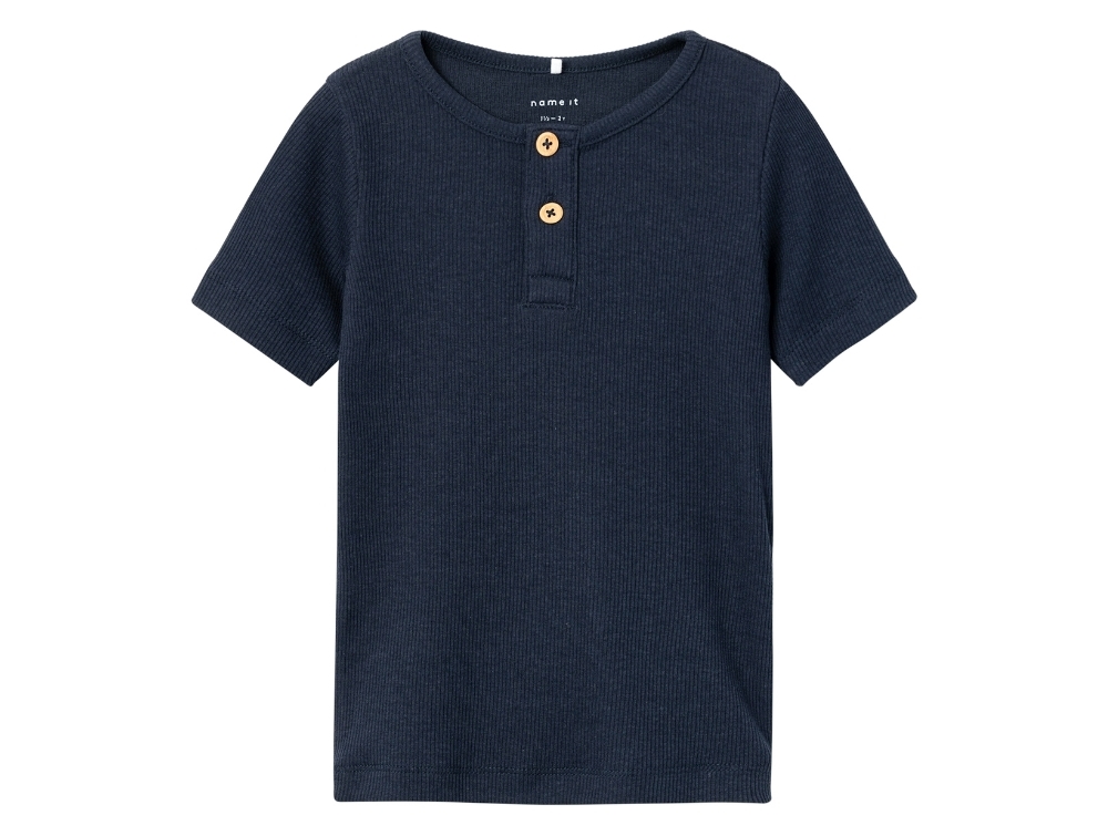 Short-sleeved ribbed t-shirt in dark blue (dark sapphire) with two buttons at the neckline from Name It.