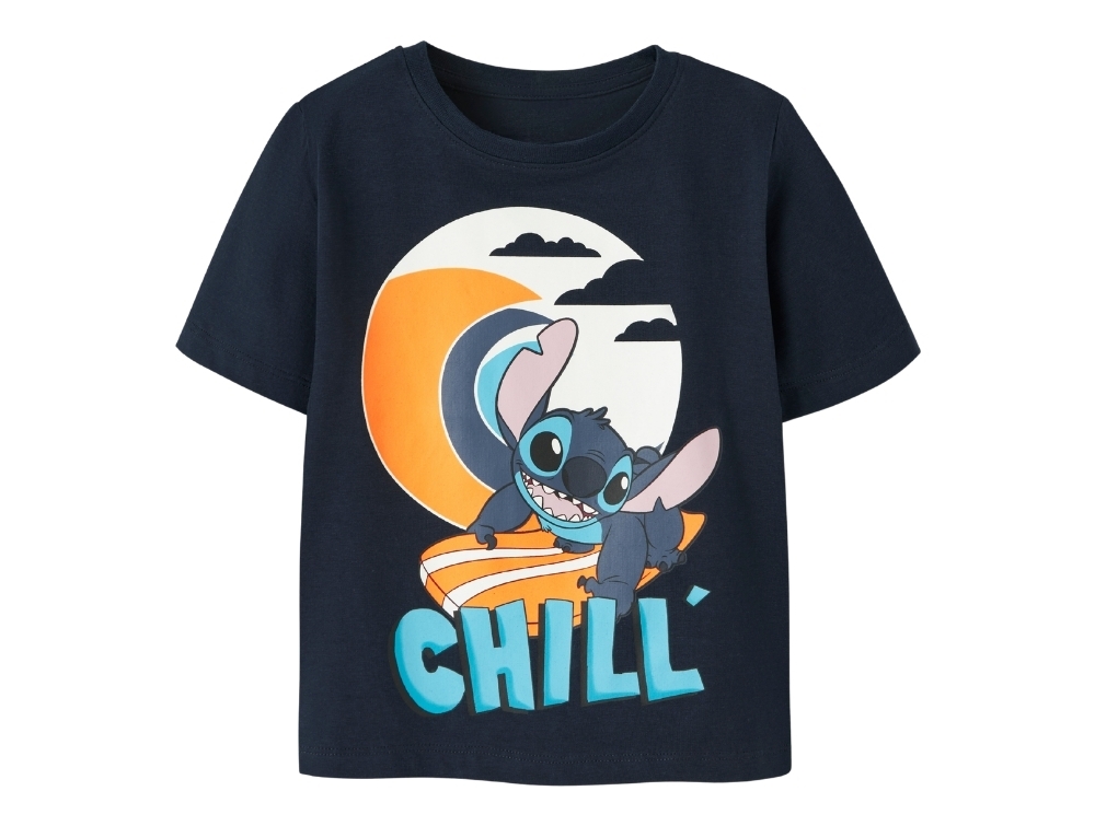 T-shirt in a dark blue shade (Navy Blazer) from Name It featuring a large print of Disney’s Stitch surfing and the text “Chill”.