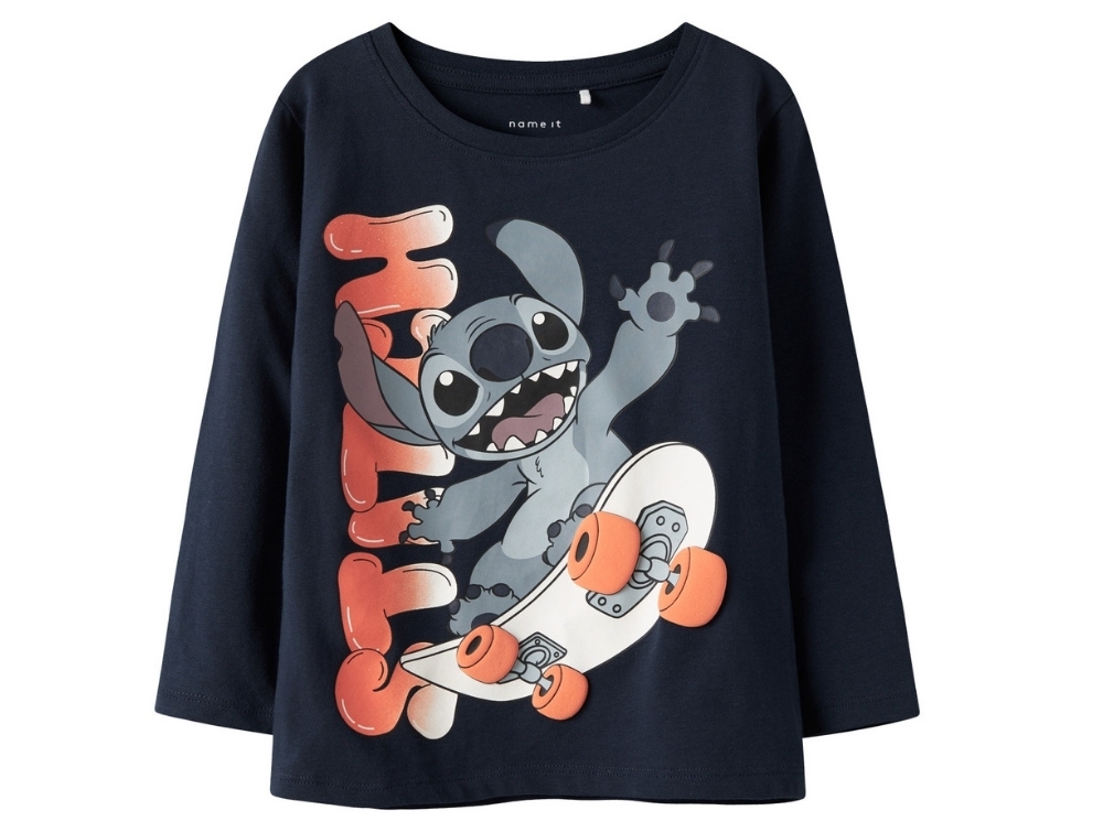 Long-sleeved t-shirt in dark blue shade from Name It featuring a cool Stitch print from Disney’s Lilo & Stitch. The t-shirt has a round neckline and a print with rubber and foam details creating a light 3D effect.