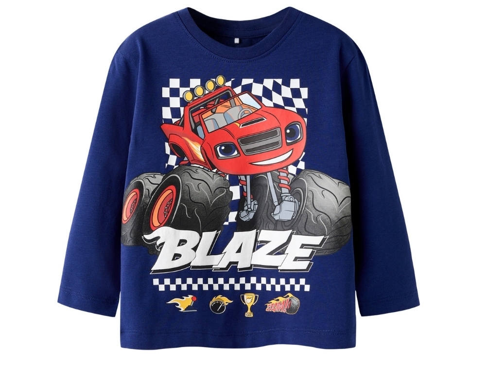Long-sleeved t-shirt in blue shade from Name It featuring a colorful Blaze print from Blaze and the Monster Machines. The top has a round neckline and a fun print with rubber and foam details that add a cool 3D effect.