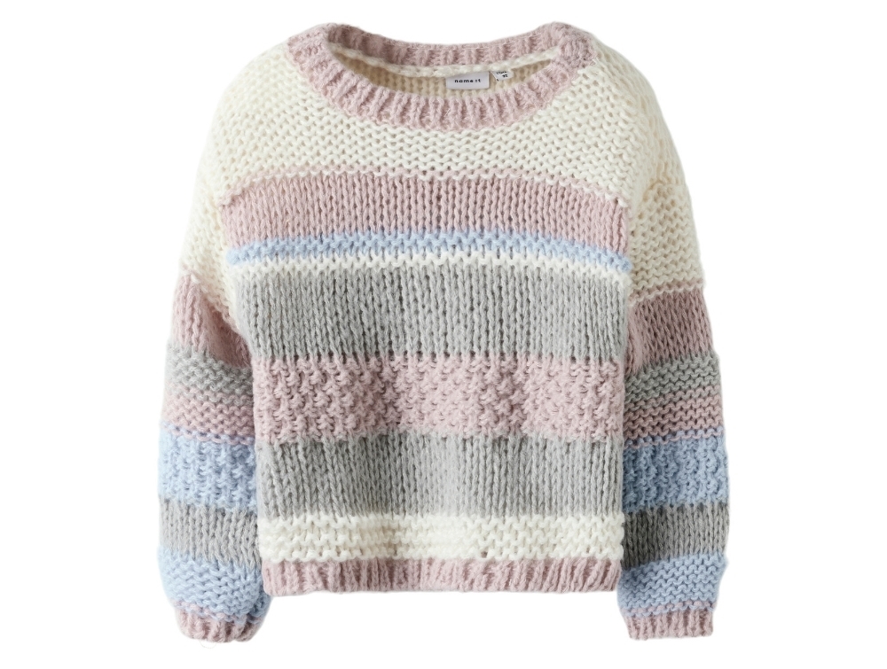 Knitted pullover in light blue shade (windsurfer) from Name It with wide stripes in pink, grey and cream.