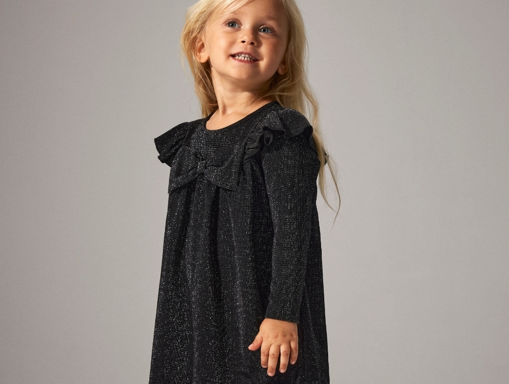 The fabric has a shiny finish, making the dress suitable for festive occasions. Made in a soft quality with a bit of stretch for a comfortable fit. Closes with button at the back.
