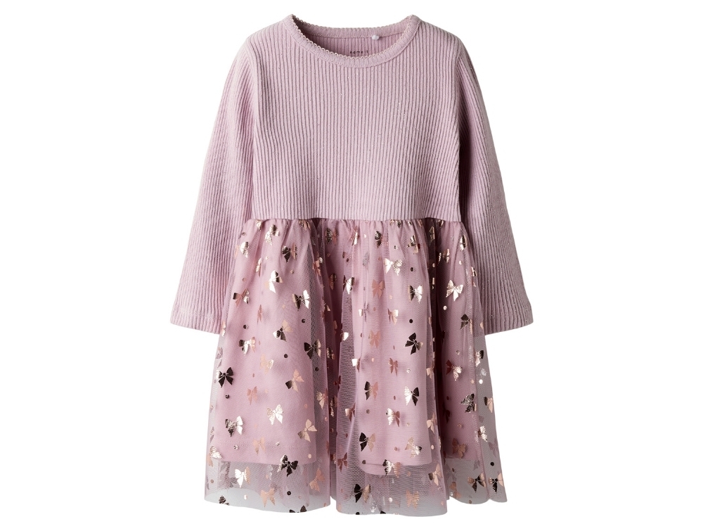 Dress in soft pink shade from Name It with rib knitted top and tulle skirt featuring shiny bow details.