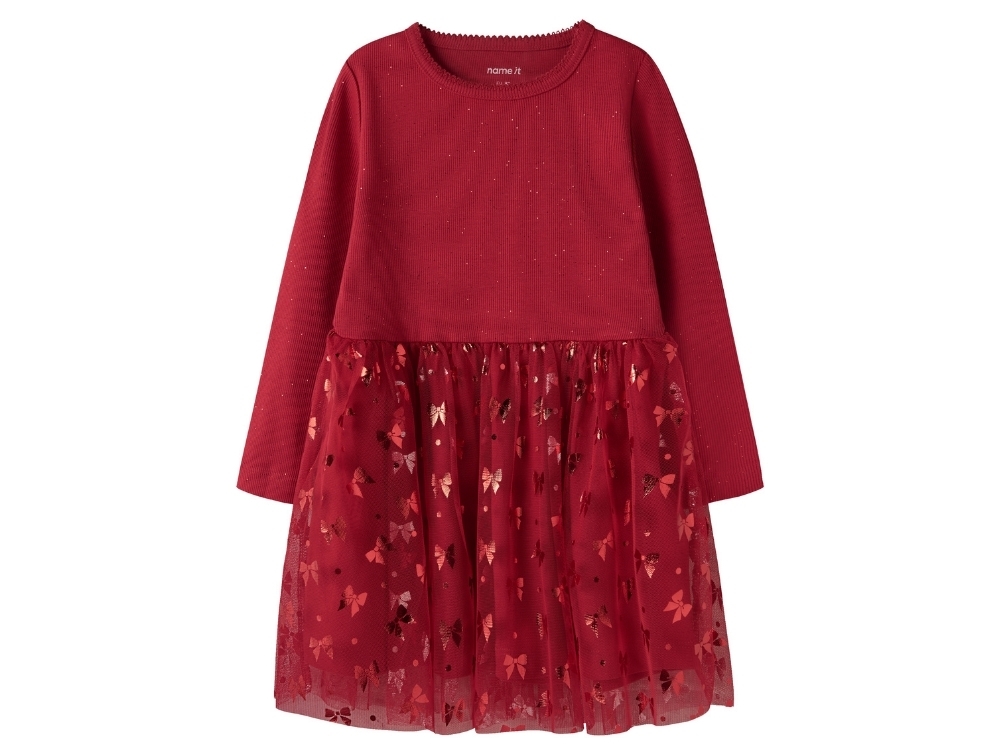 Dress in red shade from Name It with rib knitted top and tulle skirt featuring shiny bow details.