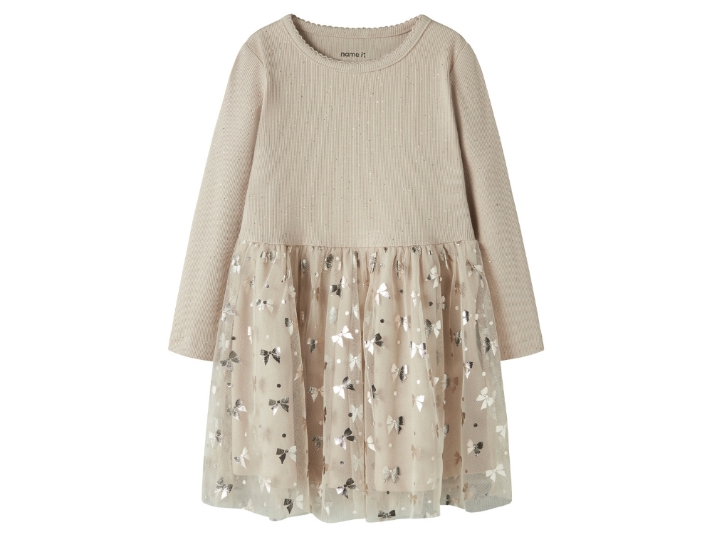 Dress in beige shade (cement) from Name It with rib knitted top and tulle skirt featuring shiny bow details.
