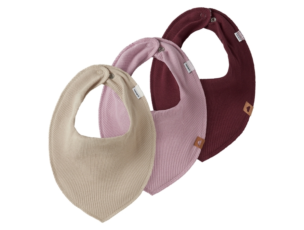 3-pack bibs from Name It in beige (cement), soft pink ( keepsake lilac) and burgundy shades.