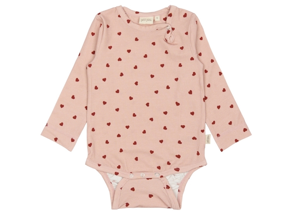 Long-sleeved body in a pink shade with red hearts from Petit Piao.