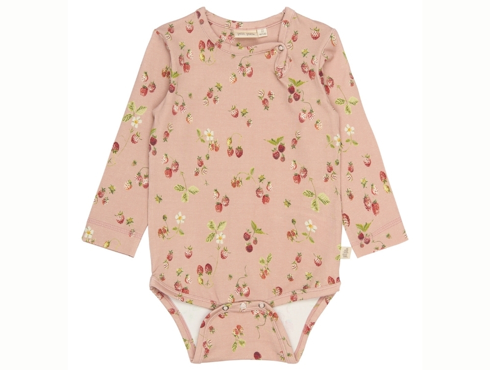 Long-sleeved bodysuit in a rose shade (Misty Rose Strawberry) from Petit Piao, featuring a delicate watercolor strawberry print.