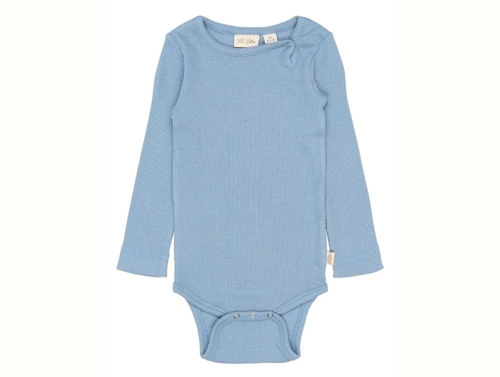 Long-sleeved bodysuit in a light blue shade (Infinity) from Petit Piao in their classic rib quality.