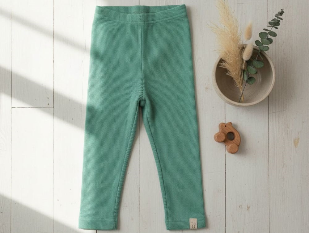 Soft leggings from Petit Piao in a nice green shade and classic ribbed quality. They feature an elastic waistband for a comfortable fit, and the fabric is both stretchy and soft, making them ideal for movement and play.