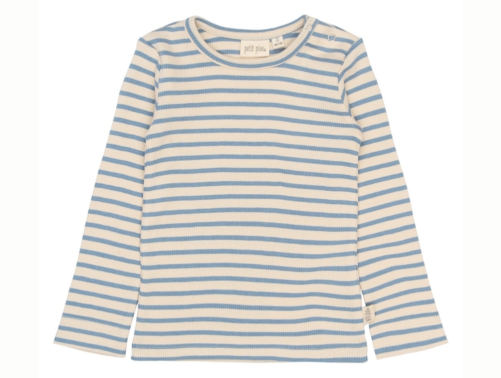 Long-sleeved blouse in an off-white shade (Infinity Striped) from Petit Piao, featuring classic blue stripes in a soft rib texture.