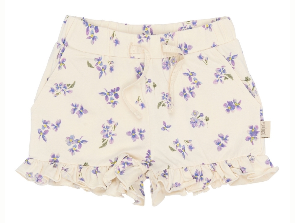 Shorts in a light off-white shade (Eggnog Viola) from Petit Piao featuring delicate watercolor violets and sweet frill details.