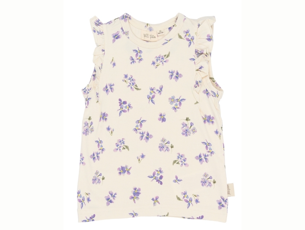 Sleeveless top in a light off-white shade (Eggnog Viola) from Petit Piao, featuring delicate watercolor violets and sweet frill details along the arm openings.