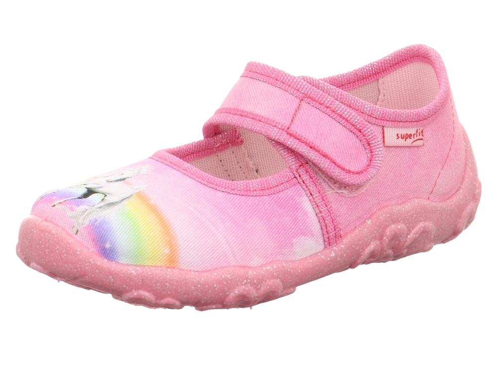 Pink textile slippers from Superfit with a sweet unicorn and rainbow motif. The BONNY model features a flexible lightweight sole with a flower pattern, providing comfort and freedom of movement. Perfect for daycare and kindergarten.