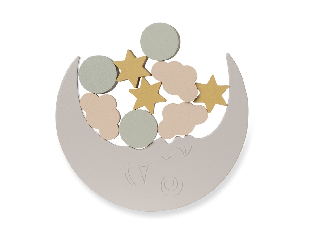 The goal is to stack the small wooden figures – stars, clouds, and circles – on top of the moon without it tipping over. A fun and calming activity that helps develop concentration, fine motor skills, and balance. When not in use, it makes a lovely decoration in the kids’ room.