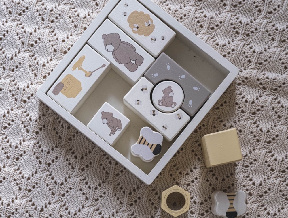 Alfie wooden activity blocks from That's Mine featuring charming bear and bee motifs in calm natural tones. Made from smooth, durable wood that’s easy for small hands to hold.