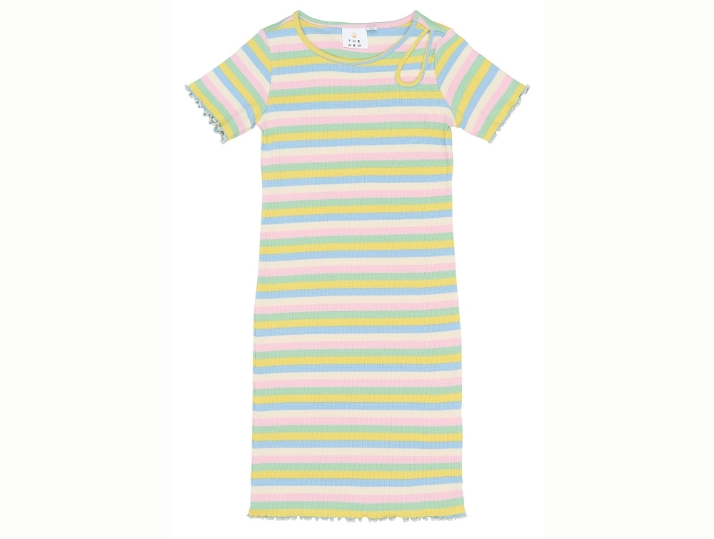 Ribbed dress from THE NEW featuring colourful pastel stripes in blue, yellow, green and pink tones.
